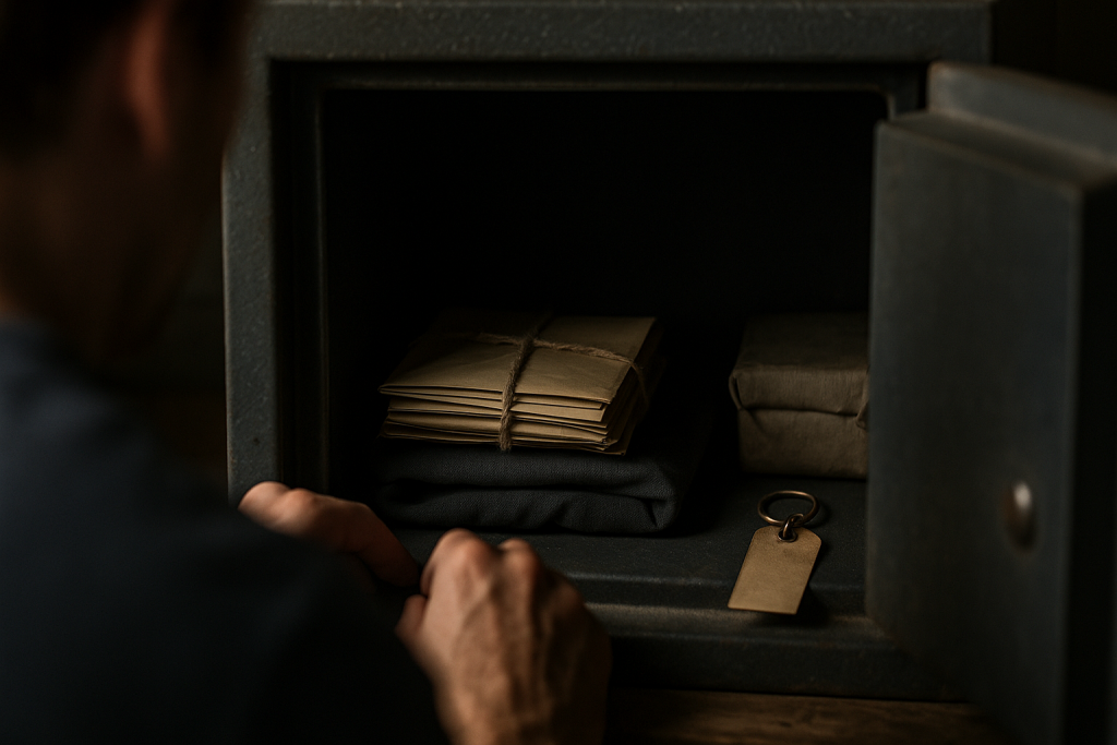 ネイトはひとつずつ机に並べていきました。手が震えます。封筒には1979年、1983年、1986年と年号が書かれていました。そのひとつの端から、古い写真がのぞいています。玄関先に立つ二人、顔はそらされ、まるで何かを隠しているよう。鍵のタグにはかすかに銀行名のような文字。ガレージの空気が重くなり、まるで過去そのものが隣に座ったような気がしました。