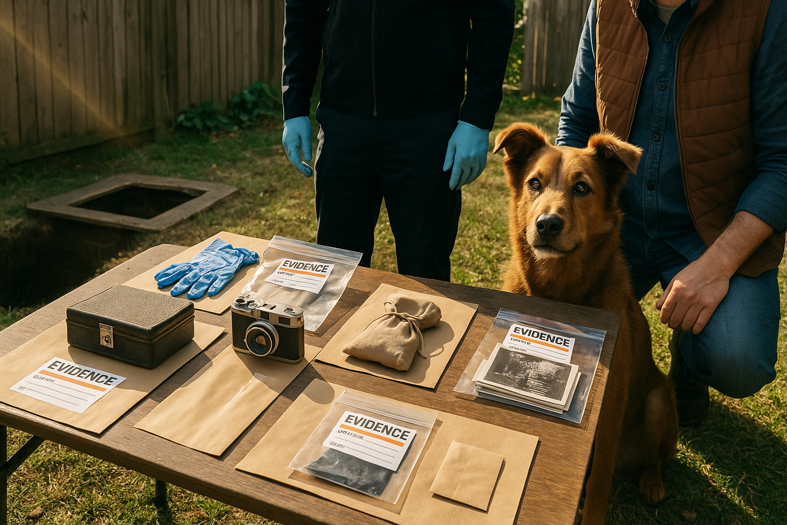 警官が包みを開くと、中から古い写真とメモが出てきました。彼はスマホで何かを確認し、小さくうなずきながら無線に「証拠を回収」「一致を確認」と報告しました。隣人は驚いた表情で、「祖父が昔、地域の人のために“もしもの時の隠し場所”を作ったって話していた」とつぶやきます。真相は思いがけないものでした。箱の中には、去年から未解決だったガレージ盗難事件の証拠品、そしてもっと古い時代の遺品が入っていたのです。底には、二つの結婚指輪とパープルハート勲章。どれも何十年も前に近所で失われ、見つからなかったものばかりでした。写真や地図の印が、それぞれの家の住所と一致していたのです。地上では何度も捜索が行われたのに、その宝はずっと、フェンスの下わずか1メートルの場所に眠っていました。犬は、隠された金属のにおいを感じ取り、誰も見つけられなかった真実を掘り当てたのです。失われた家族の宝が戻り、事件も解決。そして泥だらけの小さな英雄には、新しい首輪のタグが贈られました。そこにはこう刻まれていました。「失くしたものを見つける者